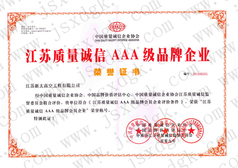 江蘇省高空行業五十強行業證書